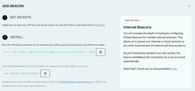 Interactive:curl -fsSL https://portal.ethiack.com/scripts/beacon/install | bash