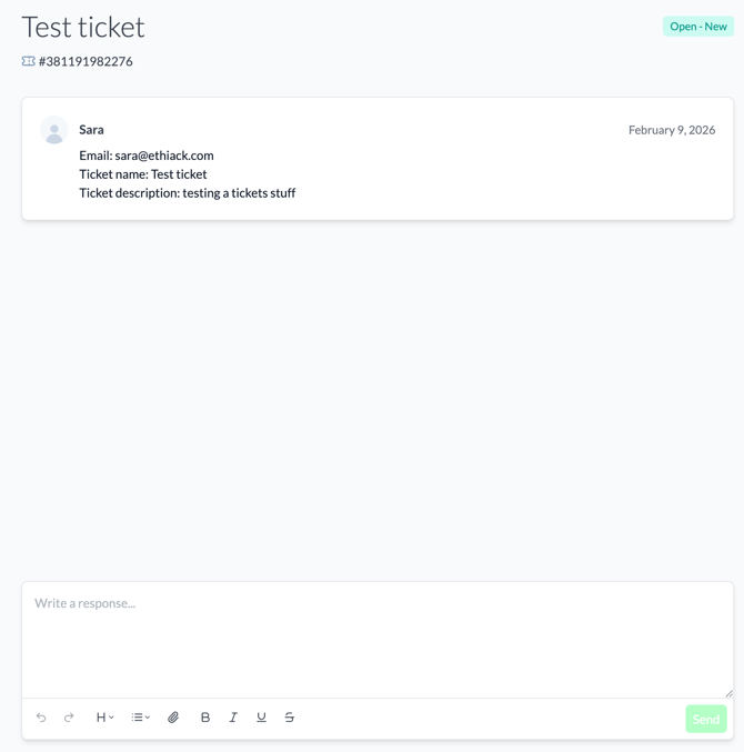 Once created, the new ticket will show in the initial page with the status 'Open'.