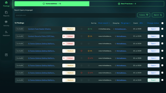 We know that not all findings require the same immediate action. We have now split findings into distinct categories: Vulnerabilities and Best Practices. This separation allows for much easier prioritization, helping you tackle critical security flaws before optimizing non-critical organizational processes.